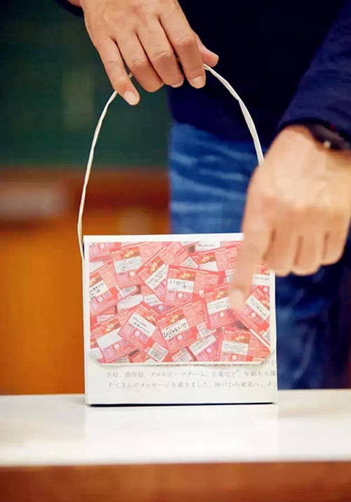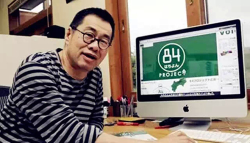 這名設計師叫梅原真,他的原始構想是:用刊載了地方新聞的舊報紙做成的購物袋來包裝土特產,許多當地的風土人情、地區特色,就能隨著客戶以及這些舊報紙購物袋,傳播出去。也許帶回到城市,顧客在回味這些美食之時會看認真看一眼地方報紙上的新聞呢,也許對〝四萬十十和〞這個小山村,就有了印象呢。梅原真先生說。
